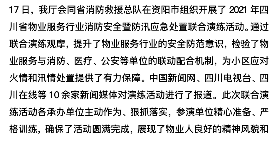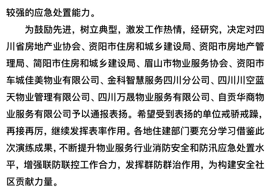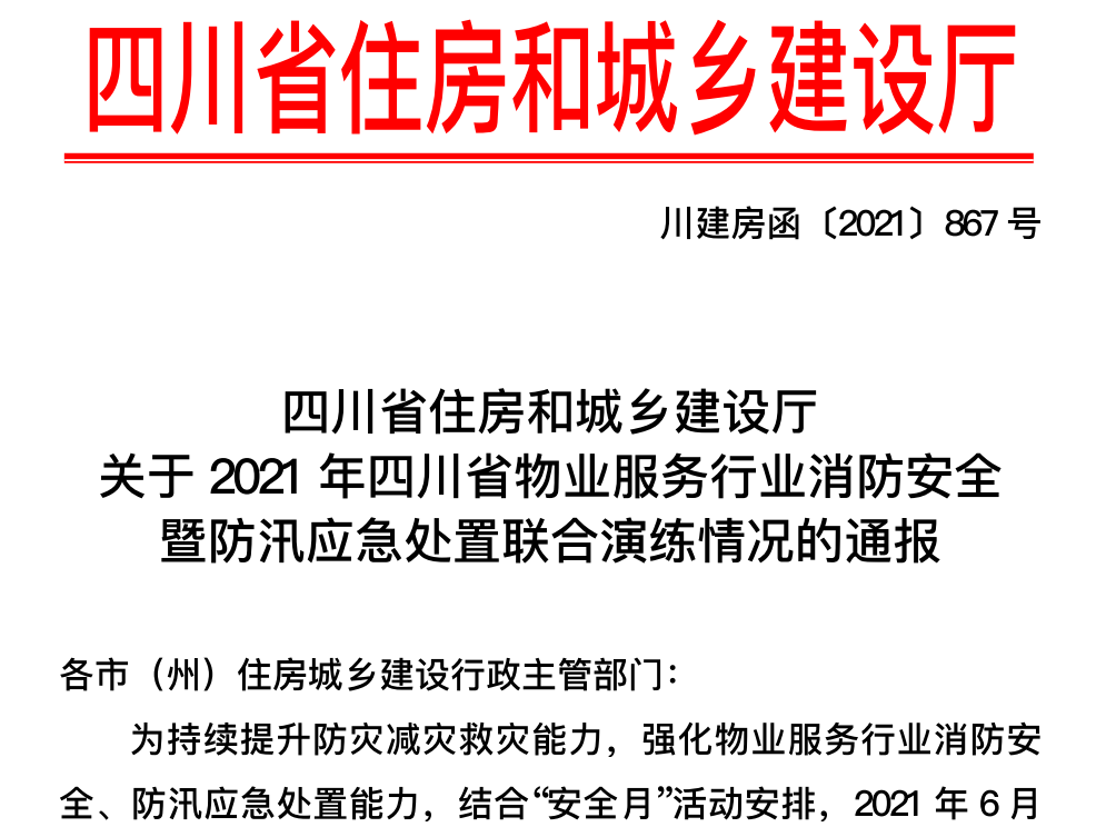 川建房函(2021)867号关于2021年四川省物业服务行业消防安全暨防汛应急处置联合演练情况的通报