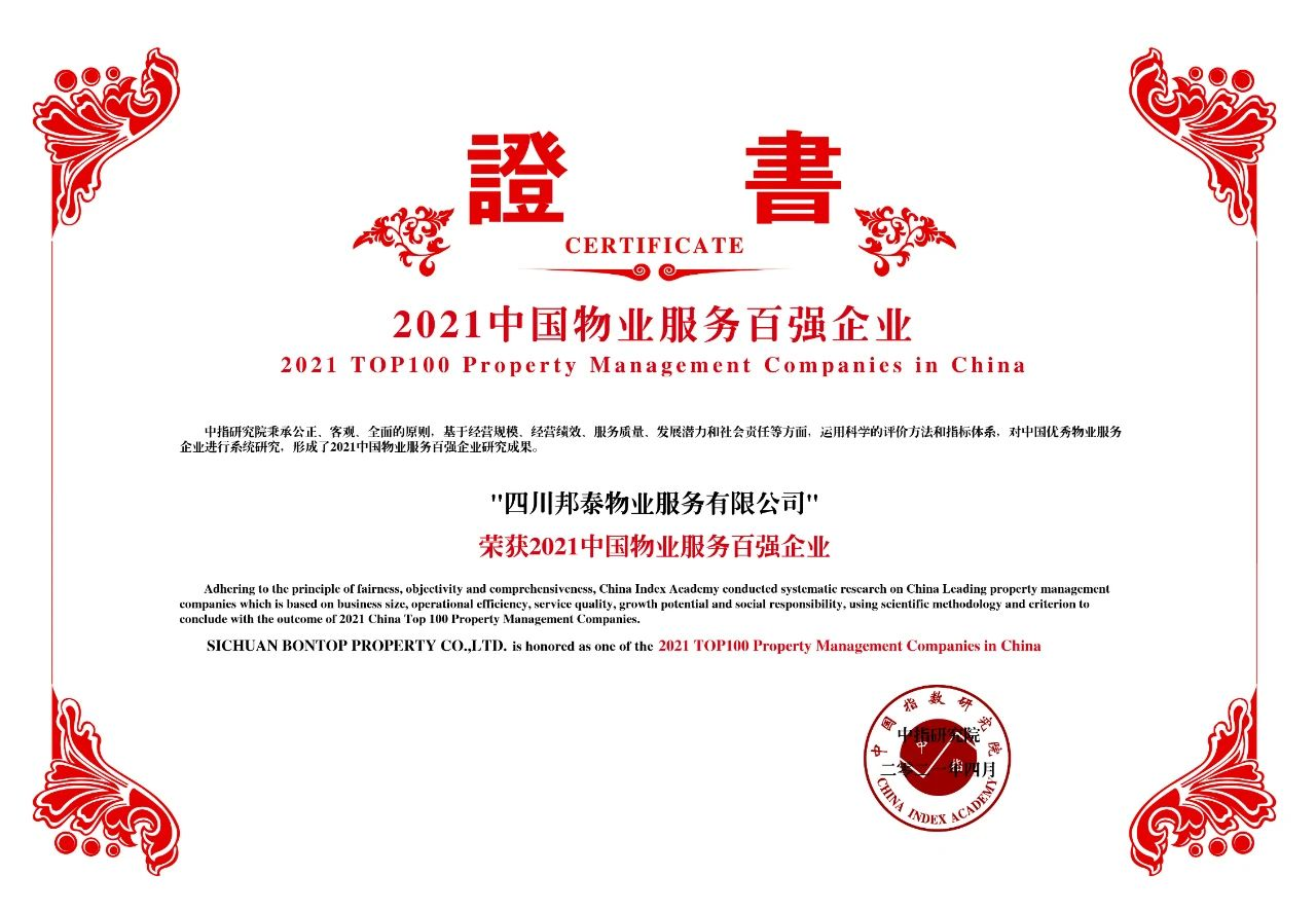 /邦泰物业荣获“2021中国物业服务百强企业”称号