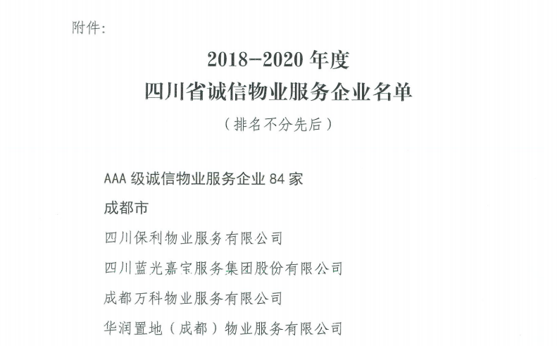 为提高物业服务企业诚信经营意识,提升物业服务品质,构建“守信激励、失信惩戒”机制,助推行业高质量发展和城市基层治理,按照国家、省加强诚信建设和行业自律的相关要求,四川省房地产业协会组织开展了2018-2020年度四川省物业服务行业诚信评价工作。