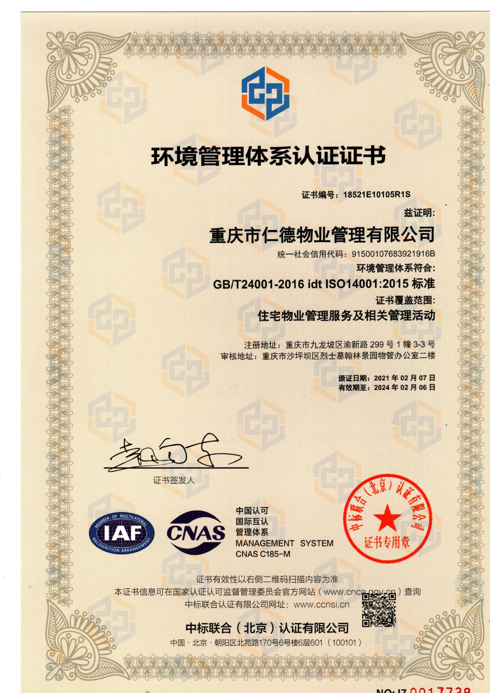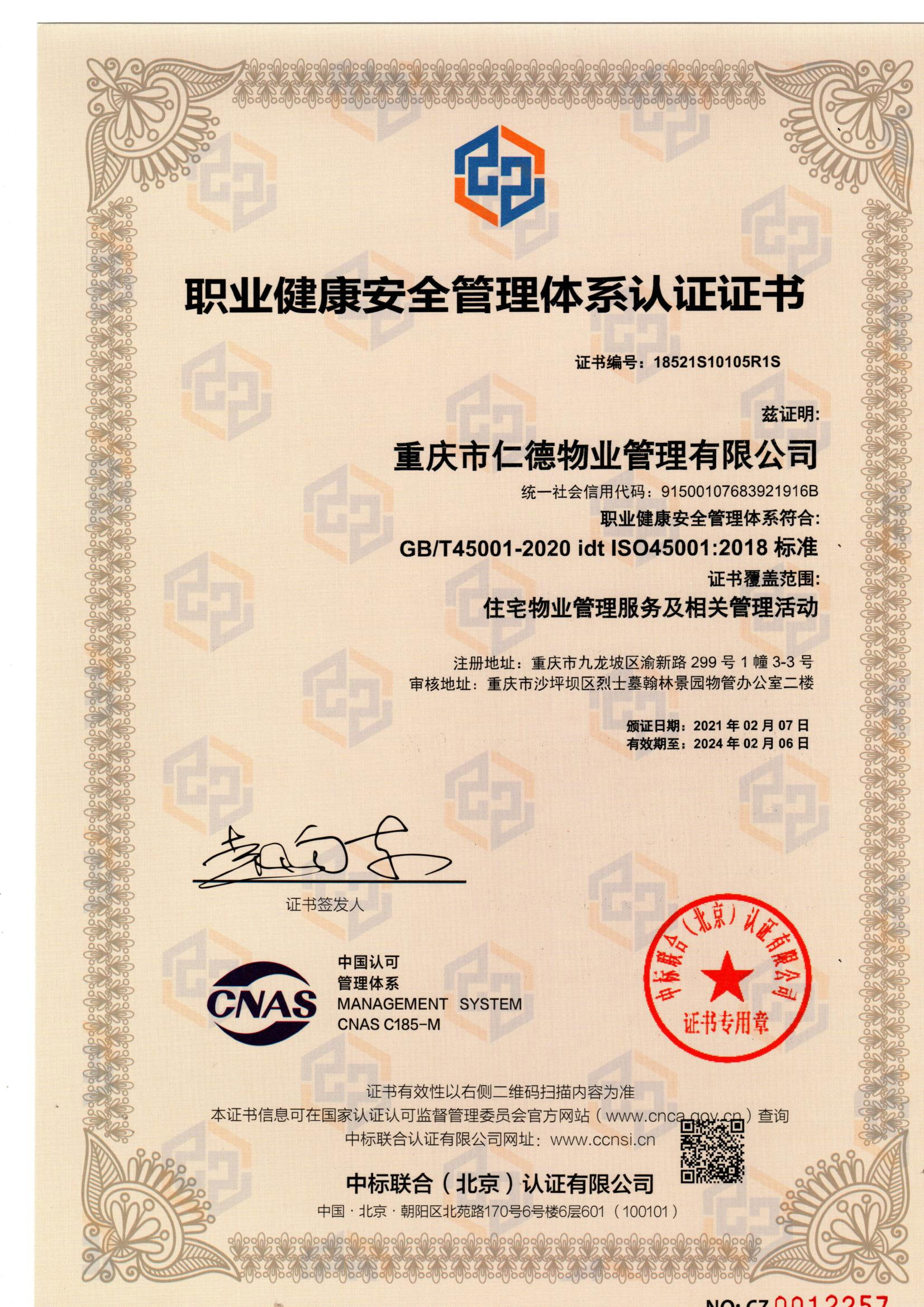 重庆仁德物业ISO体系证书