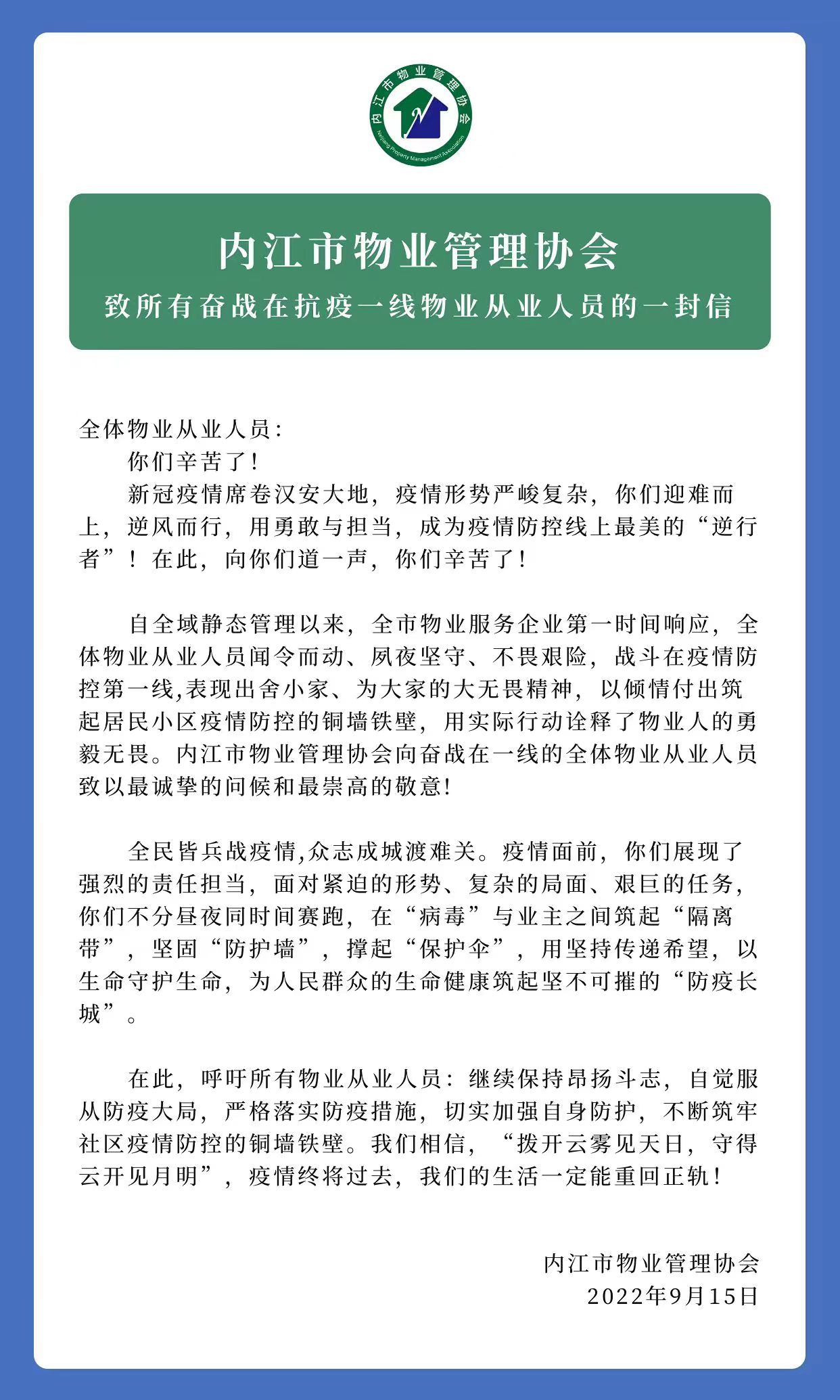 致所有奋战在抗疫一线物业从业人员的一封信