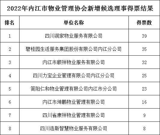 按照《内江市物业管理协会章程》规定,《关于协会增补理事的通知》(内物协[2022] 第18号)和《关于2022年增补理事单位选举的通知》(内物协[2022] 第24号)工作要求,经过单位申请、会员大会选举和结果统计,目前协会会员单位共72家,参与此次投票的会员单位共51家,参与单位数量达到总会员数的2/3以上,符合协会章程规定,现将投票结果公布如下:
