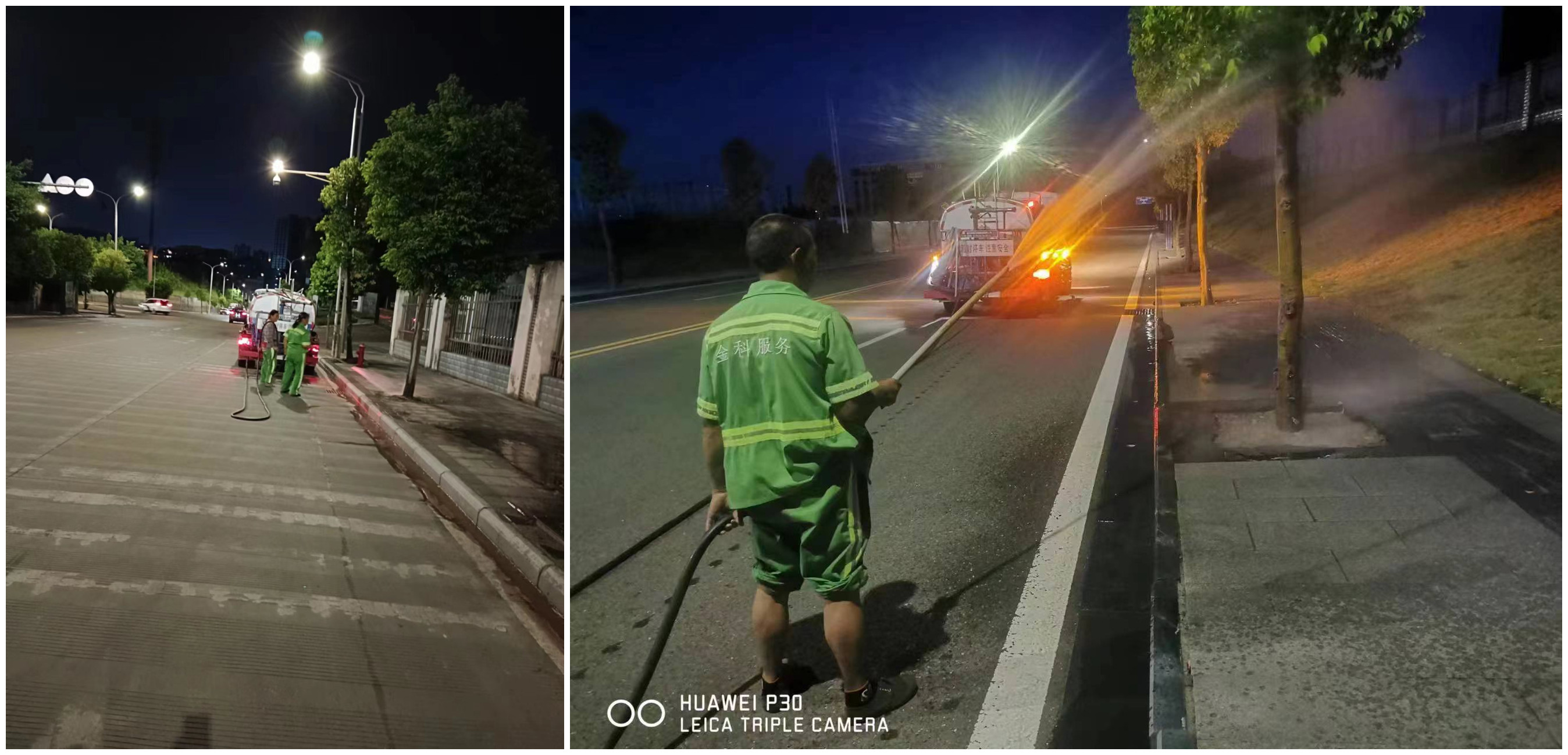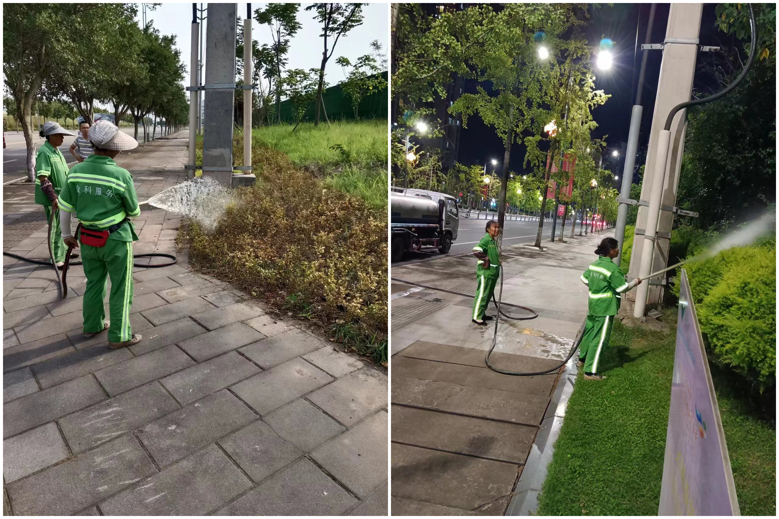 当晨光初现,夜幕降临,物业服务人员架着水枪穿梭在一条条道路上。任汗水浸湿背上的衣服、打湿眼眶和发线,在他们看来,身上的是水还是汗,早已分不清了......