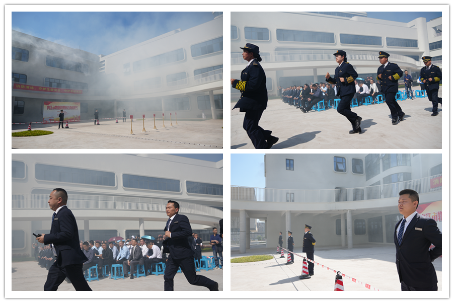 消防演练开始,参演人员从初期火灾的扑救、控制、火场协调指挥,火场人员疏散引导,灭火器材现场灭火,火灾事故处理等几个方面进行展示。