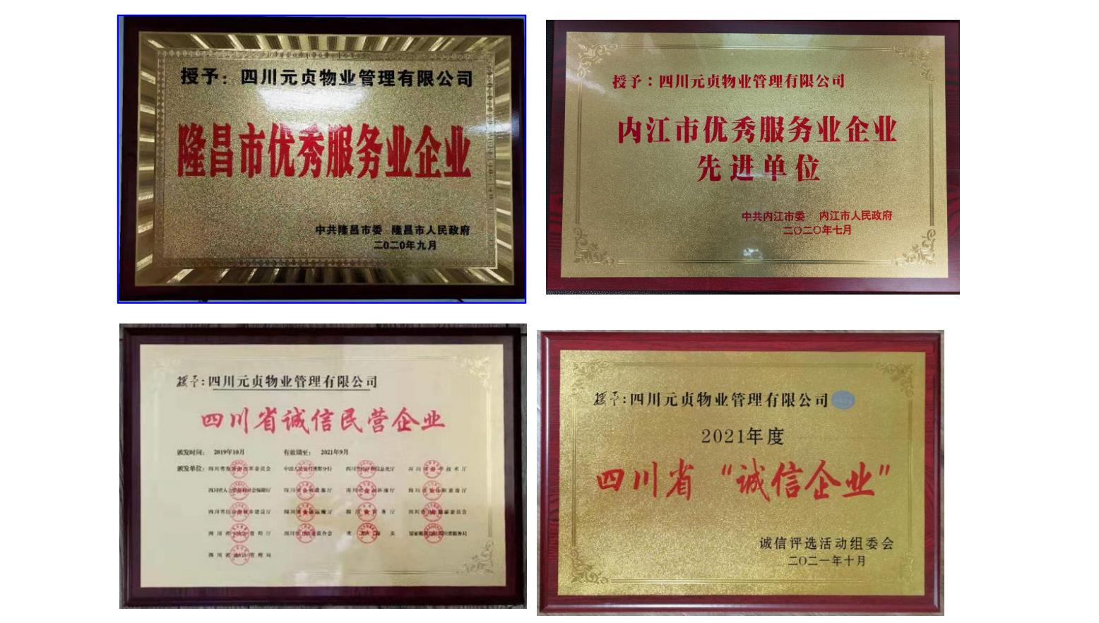 公司始终坚持以物业服务为重心,已经形成多业态、多元化的综 合服务体系,业务拓展至保安服务、环卫保洁、房产中介租赁服务、 景区服务管理等。公司由粗放式管理到规范化管理,逐步建立起现代 规范的企业管理制度并锻造了一支过硬的管理团队。新一届班子调整 了公司发展战略目标,进行了一系列内部整顿,转变经营思路,努力 提高员工的服务意识,促进公司整体由“管理”向“服务”的方向发 1展。围绕着新的工作目标开展工作,管理工作结合实际情况,持续改 进服务品质稳步上升,公司整体面貌日新月异,努力适应新形式下的 发展要求,在强调“服务深层次、管理上台阶”的基础上,积极参与 市场竞争,依靠拼搏实干的精神和持久创新取得飞速发展,面向市场, 以“互联网+”创新思维促服务转型升级,管理经验和作业水平得到 较大提升。通过了 ISO9001 质量体系认证、ISO14001 环境管理 体系认证、ISO45001 职业健康安全管理体系认证、3A 级信用证书, 先后获得了“内江市优质诚信示范单位”;“全国质量·诚信服务 AAAAA 级物业管理企业”;“质量诚信金口碑物业”;连续 3 年被评为“四川 省诚信企业”;2020 年被内江市委、市政府授予“内江市优秀业服务 业企业先进企业”、隆昌市委、市政府授予“隆昌市优秀业服务业企 业”、隆昌市委组织部授予“新冠肺炎疫情防控先进集体”;2021 年 被隆昌市房管局授予“新冠肺炎疫情防控工作先进单位”等荣誉称号。