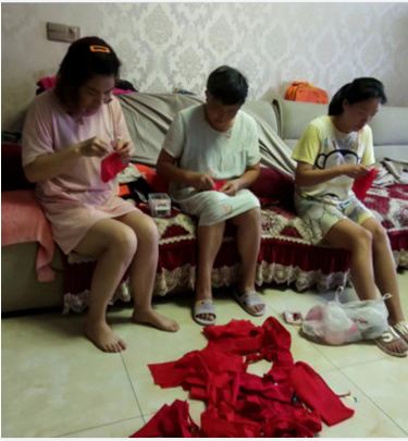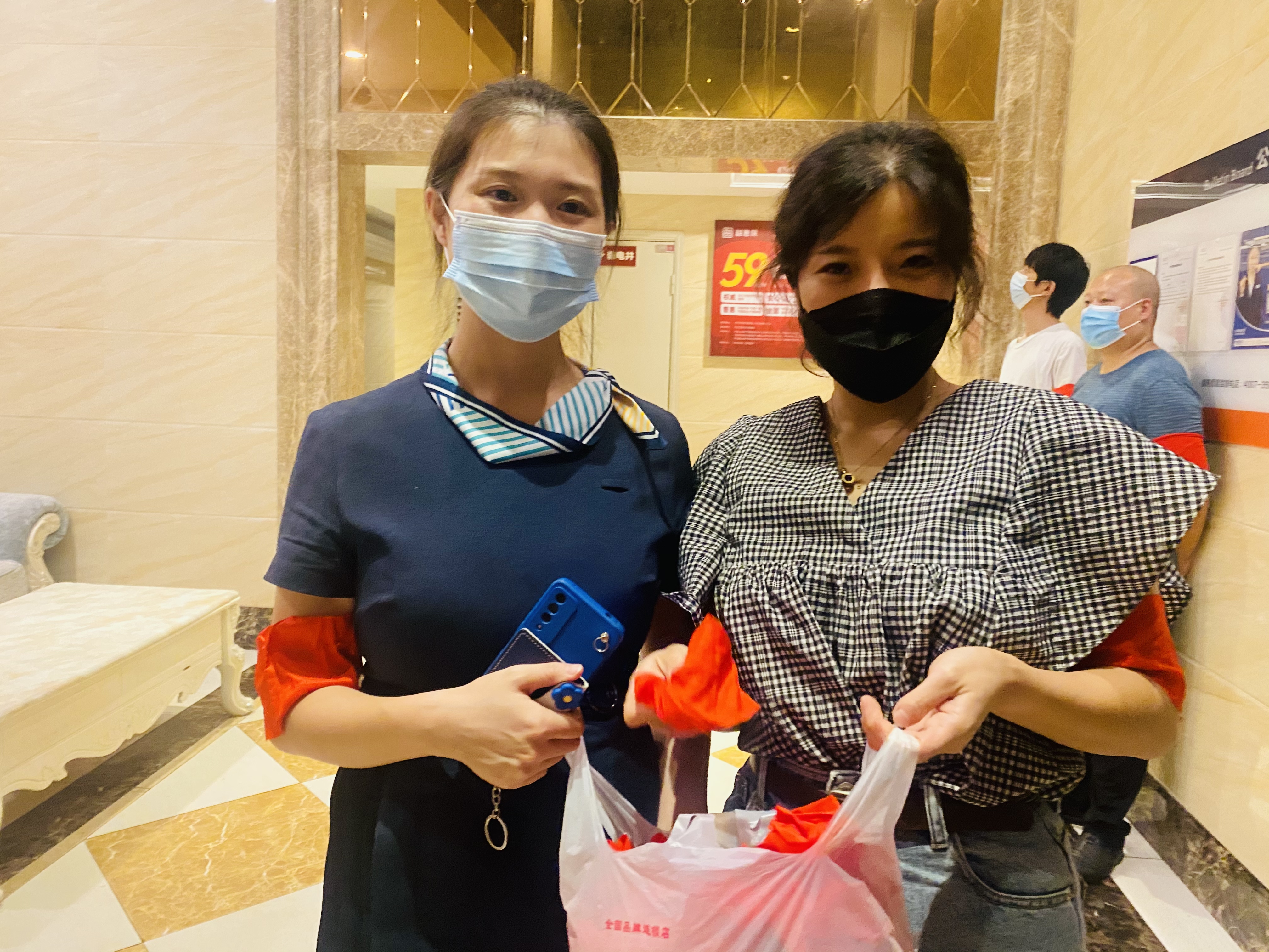 21栋几户业主得知情况后,积极把家里的红布找出来缝制简易红袖标。6个业主下午3点开始忙碌,到晚上9点过缝制出120多个红袖标,并及时交给物业公司。