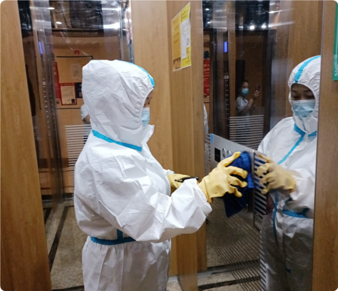 进入全域静态后,有80%的员工不能回家,且工作量是平时的3倍以上,累了打个盹、渴了喝口水,睡地铺啃干粮,他们没有一句怨言,每天坚持完成对小区道路、地下车库、小区大门、单元门、单元门厅、垃圾桶3次喷洒消毒,不少于5次对电梯轿厢、单元门把手、电梯按键等业主经常用手碰触的地方擦拭消毒,每天不少于1次对园区进行大型消杀,截止目前,累积消毒消杀110余万平方米。