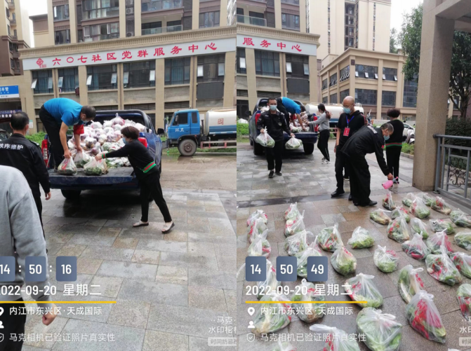 简阳仁和物业所服务的天成国际⼩区,物业⼈员同志愿者每 天忙碌的为居⺠购买并配送蔬菜包等,物业⼈员与志愿者将蔬菜 包消毒后依次为业主们配送到位。