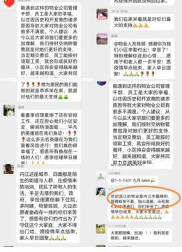 世纪滨江⼆期业主正义(微信名)在业主群⾥发⾔:“能遇到 这样的物业公司管理⼲部和员⼯是⼤家的幸福,建议⼤家邻居要 更多的理解 ,按时交纳物管费就是对他们更好的⽀持……”