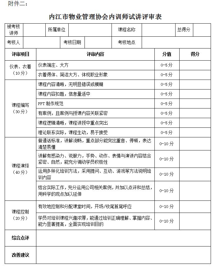 附件二:内江市物业管理协会内训师试讲评审表