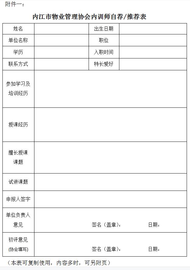 附件一:内江市物业管理协会内训师自荐/推荐表