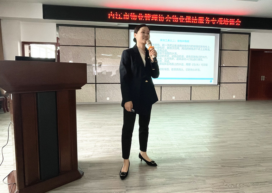 此次培训由协会内训师四川美立华生态环境集团有限公司邓兰英老师主讲,培训中授课讲师从四个方面讲解:一是工具和药剂的规范使用,详细介绍了保洁常用工具、使用方法及日常保养要点,强调工具需分类存放,避免交叉污染。在药剂使用方面,明确不同污渍对应的药剂选择标准,同时强调操作时的防护措施与禁忌,防止安全事故发生;二是保洁工作程序与服务内容,结合行业规范,梳理了保洁作业程序、服务内容、操作规程等,对清洁频率、质量要求进行量化说明,确保公共区域无积尘、无污渍、无异味;三是不同场景的保养及标准,针对公共洗手间、不锈钢表面、地面果皮箱、地面喷水池等场景制定了专项保养标准、作业程序、注意事项,保障设施完好整洁;四是礼貌用语、行为规范与仪容仪表,强调保洁人员也需注重服务礼仪、仪容仪表等方面,要求统一着装、佩戴工牌,保持衣物整洁、头发整齐,不佩戴夸张饰品,作业时主动避让业主;礼貌用语方面,推广 “您好”“麻烦您”“谢谢”“打扰了” 等常用文明用语,提升服务温度。