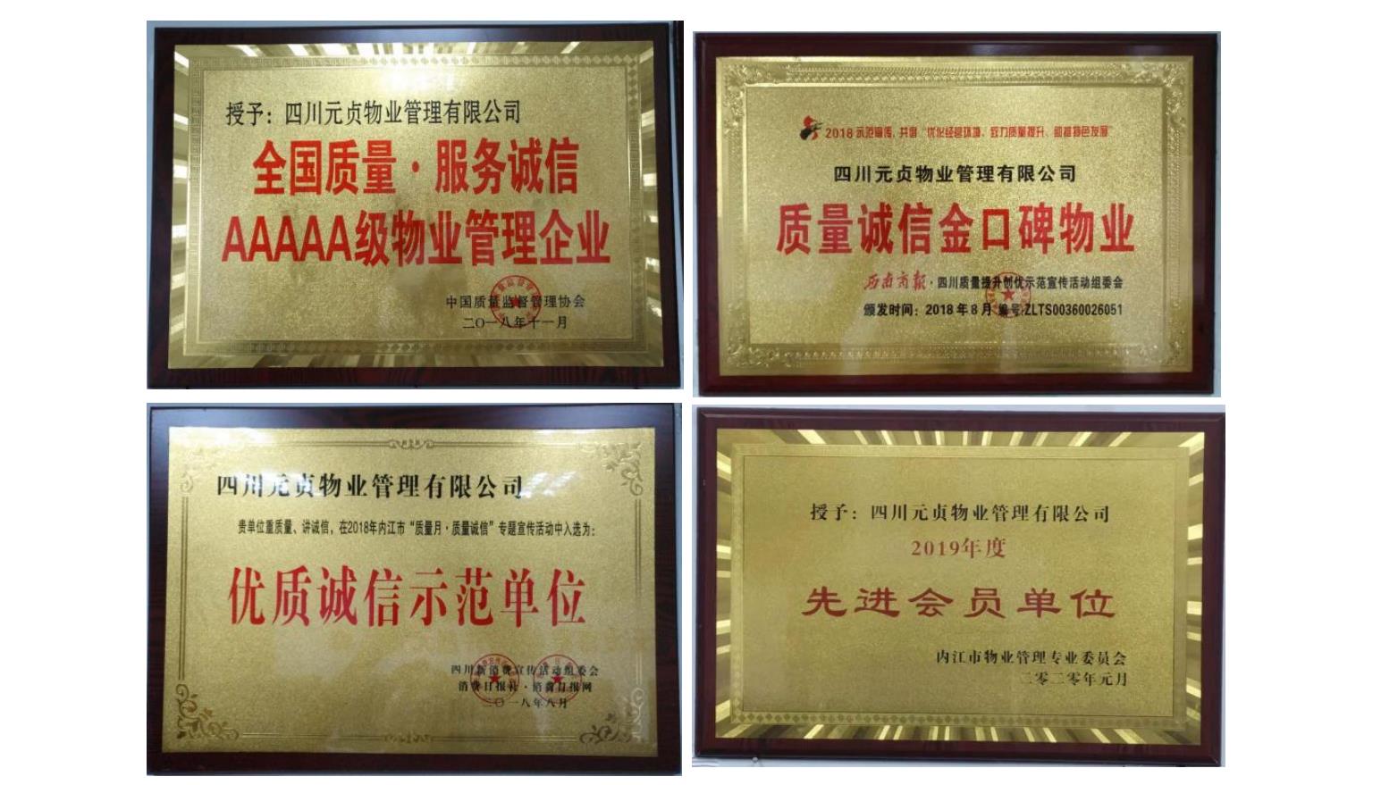 公司始终坚持以物业服务为重心,已经形成多业态、多元化的综 合服务体系,业务拓展至保安服务、环卫保洁、房产中介租赁服务、 景区服务管理等。公司由粗放式管理到规范化管理,逐步建立起现代 规范的企业管理制度并锻造了一支过硬的管理团队。新一届班子调整 了公司发展战略目标,进行了一系列内部整顿,转变经营思路,努力 提高员工的服务意识,促进公司整体由“管理”向“服务”的方向发 1展。围绕着新的工作目标开展工作,管理工作结合实际情况,持续改 进服务品质稳步上升,公司整体面貌日新月异,努力适应新形式下的 发展要求,在强调“服务深层次、管理上台阶”的基础上,积极参与 市场竞争,依靠拼搏实干的精神和持久创新取得飞速发展,面向市场, 以“互联网+”创新思维促服务转型升级,管理经验和作业水平得到 较大提升。通过了 ISO9001 质量体系认证、ISO14001 环境管理 体系认证、ISO45001 职业健康安全管理体系认证、3A 级信用证书, 先后获得了“内江市优质诚信示范单位”;“全国质量·诚信服务 AAAAA 级物业管理企业”;“质量诚信金口碑物业”;连续 3 年被评为“四川 省诚信企业”;2020 年被内江市委、市政府授予“内江市优秀业服务 业企业先进企业”、隆昌市委、市政府授予“隆昌市优秀业服务业企 业”、隆昌市委组织部授予“新冠肺炎疫情防控先进集体”;2021 年 被隆昌市房管局授予“新冠肺炎疫情防控工作先进单位”等荣誉称号。