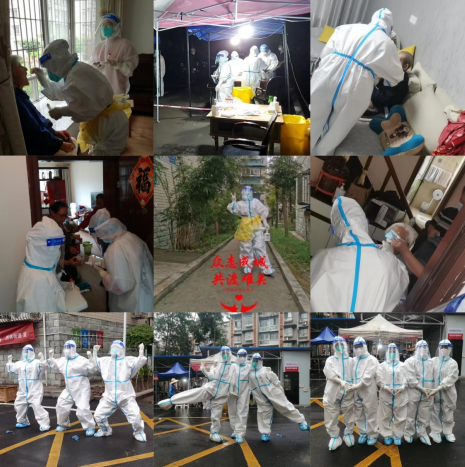 抗疫初期的⾼温,核酸扫码者穿着密不透⻛的防护服,汗⽔ 不仅湿透了⾐背,⽽是感觉从⽔⾥捞出来的⼀样,浑身湿透,冒着中暑的⻛险,咬⽛坚持,核酸扫码者已算⾟苦,核酸采样的医 护们防护要求更⾼,且因⼈⼿有限⽆法替换,为了节约珍贵的防 护装备,不能喝⽔不能上厕所,需要在防护服⾥待四个⼩时,闷 热难受的滋味⽆以⾔表。他们分别是威远县新场镇卫⽣院:宋柳 毅,温馨,倪志芬,威远县东联镇卫⽣院两⼈及其他未能留下信 息的医护⼈员。当他们在核酸采样⼯作结束后,搭乘出租⻋去内 江师院⽅舱送物资,出租⻋司机知道她们是医护⼈员后,坚持免 收⻋费,感动着⼤家,⼜因上⻔为 92 岁⾼龄的⽼⼈采核酸时,⽼ ⼈深表感谢的鞠躬,⽽眼泛泪花,这就是我们可爱的⼤⽩们,新 时代最可爱的⼈,居⺠们都昵称“⼩可爱”。