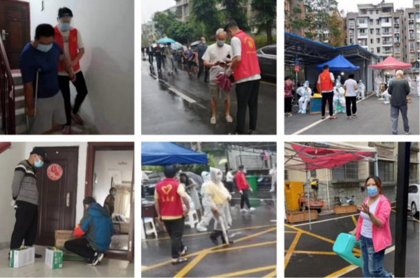 在⼩区中,平时⼤多擦肩⽽过,有的打个招呼,但当疫情来 临时,他们默默付出,共同守护我们的家园,有这么⼀群⼈主动 请缨,⾃愿加⼊这场“战疫”之中,筑起疫情的“防护墙”,守护着 居⺠的⽣命防线,他们就是志愿者。 当社区发出志愿者召集通知后,⼩区居⺠踊跃报名,我是党 员、我是退役军⼈、我是教师、我是⼤学⽣……短短⼏天,志愿 者队伍从⼆⼗余⼈迅速扩⼤到⼋⼗余⼈,全⼒投⼊到为⼩区⼀千 五百多位居⺠的服务⼯作中去,社区准备的⼏⼗个志愿者袖标⽤ 完了,居⺠们就拿出各⾃家⾥的志愿服务袖标、志愿者背⼼等交 给志愿者们使⽤,仍有许多志愿者并⽆标识,却并不影响他们的 志愿服务。 刚开始,仅凭着⼀腔的热⾎,显得有点杂乱⽆章,但通过短 短⼏天的磨合,迅速理清思路,将⼏⼗⼈的队伍组建起扫码组、 消杀组、药品组、统计组、秩序组、通知组等专业分组,各司其 职,使⼩区内各项⺠⽣基础服务有序进⾏,核酸采样时保持距离 秩序井然,并细⼼的安排学⽣先采以免影响⽹课学习,安抚居⺠ ⻓时间居家的焦躁情绪。 ⼩区内现有居⺠ 882 户 1500 余⼈,每天早上 5:30 开始组织 居⺠开展核酸检测采样,志愿者们⼀站就是⼏个⼩时,来不及吃 饭喝⽔,有事还要⾯对个别居⺠的不理解,却从⽆怨⾔。提醒规 范佩戴⼝罩、为居⺠订购物资、⽣活⽤品分发、消毒、值守巡护 都是志愿服务中的⽇常,相互⼤多并不认识,都在默默奉献,因 为全员绿码⽽欢呼,为了胜利的曙光早⽇到来,⼩区内始终闪耀 着艳丽的“志愿红”。