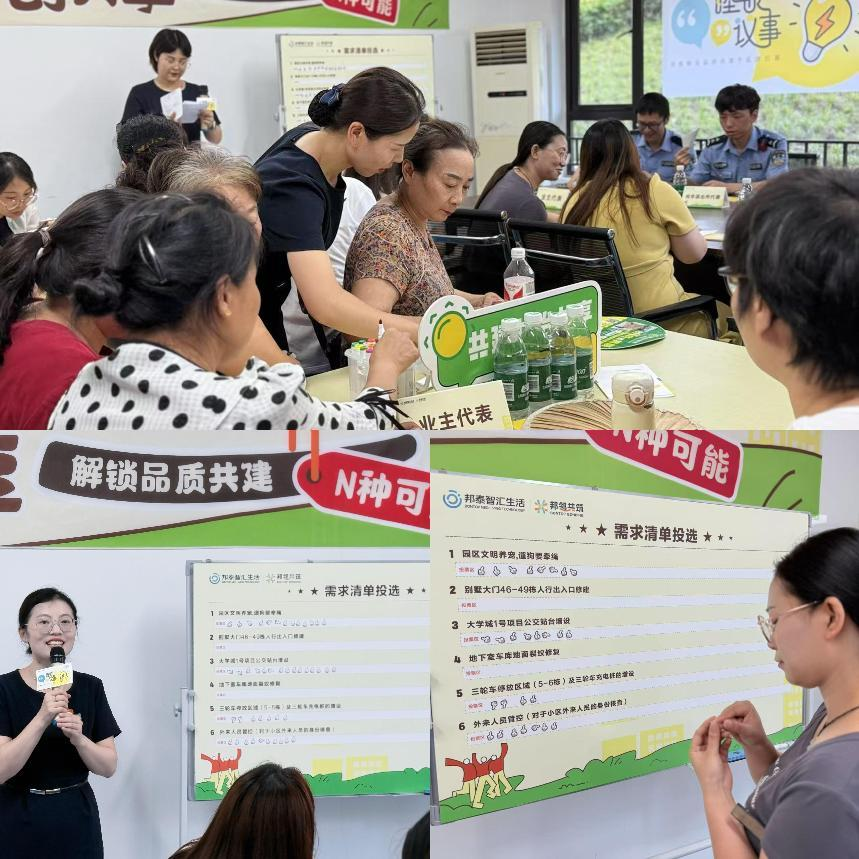 在业主共创环节,现场气氛热烈,智慧火花迸发。业主代表踊跃发言,围绕提升居住品质集思广益,当场凝练出五项宝贵议题建议:增设小区健身器材、规划公共晾晒区域、扩容非机动车停放空间、优化架空层娱乐设施开放时间管理、科学调整园区照明时段。这些来自居民日常生活的真实声音,为后续社区精细化服务指明了方向。