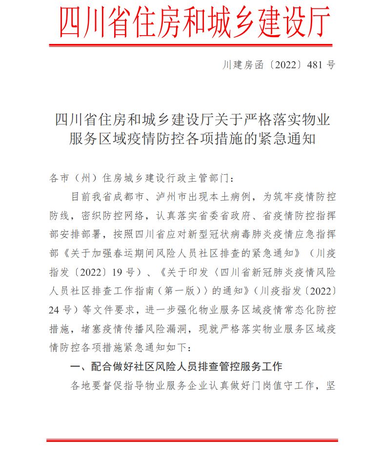 四川省住房和城乡建设厅关于严格落实物业服务区域疫情防控各项措施的紧急通知